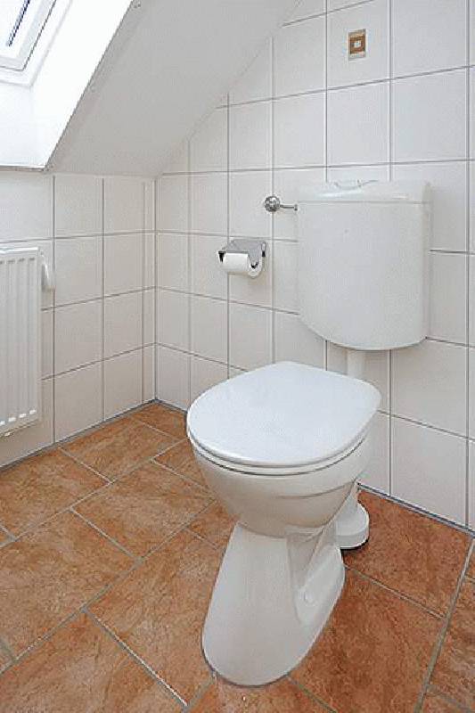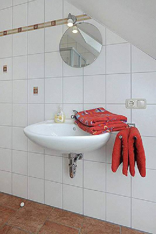 • Badezimmer mit Dusche, Waschtisch und WC