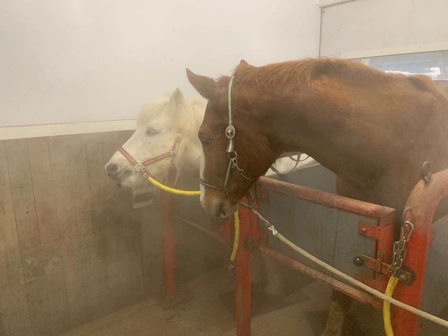 Auch die Rauminhalation in der Solekammer hat sich, vor allem zu Beginn der Kur sehr bewehrt. Die Pferde gehen in der Regel zu 2.hinein. Anfangs sind sie etwas skeptisch aber dann merken sie, dass es einfach nur gut tut.
